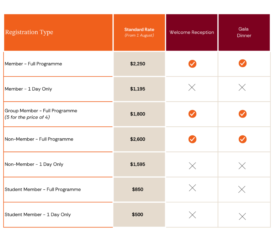 All registration fees are listed in AUD and include GST.
