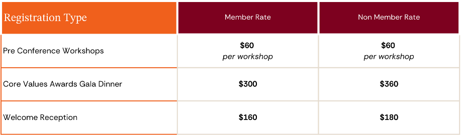 * Workshop selection will open closer to the event. Sessions run for 90 minutes between 2pm - 6pm on Monday 27 October. Pre Conference Workshops can be purchased for $60 each. Complimentary workshops are not included with standard rate registrations.